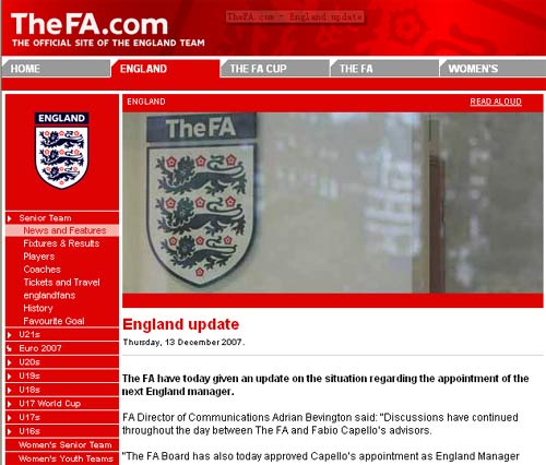 中新網(wǎng)12月14日電 萬眾聚焦的英格蘭選帥今天終于接近水落石出,英格蘭足總今天凌晨在其官方網(wǎng)站上透露了選帥的最新進(jìn)展,卡佩羅入主已基本定局。