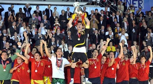 北京時(shí)間6月30號(hào)凌晨,2008歐洲杯決賽在奧地利維也納的恩斯特-哈佩爾球場(chǎng)打響。西班牙隊(duì)1比0力克德國(guó)隊(duì)奪得冠軍,斗牛士軍團(tuán)44年后再次登上歐洲之巔!敖鹜蓖欣姿勾蛉肴珗(chǎng)唯一進(jìn)球。由于德國(guó)隊(duì)的波多爾斯基沒能取得進(jìn)球,本場(chǎng)因傷休戰(zhàn)的西班牙射手比利亞以4個(gè)進(jìn)球當(dāng)選最佳射手。
