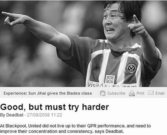 賽后英國專業(yè)足球網(wǎng)站《Rival》用“不錯,但要更加努力”的題目來形容這場比賽,畢竟主場平局對于謝菲聯(lián)隊來說顯得有些可惜,他們本來有機會取得勝利。不過這家網(wǎng)站仍然夸獎了幾名主場球員,中國球員孫繼海是其中之一,文章中如此評價:“在周六的比賽中,孫繼海、斯皮德和埃希奧古使得刀鋒軍團看起來擁有更多的比賽經(jīng)驗,但是當機會到來的時候,球隊并沒有很好的把握!绷硗馕恼掠靡粡垖O繼海在場上的照片作為配圖,圖注上寫著:“孫繼海用經(jīng)驗提升了謝菲聯(lián)隊的水平!(藍羔)