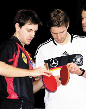 波爾是德國乒乓球的標(biāo)志性人物,而在德國最為普及的足球運(yùn)動(dòng)里,也有不少國腳喜歡打乒乓球。北京時(shí)間昨天凌晨,德國國家隊(duì)在柏林奧林匹克球場進(jìn)行訓(xùn)練,在新聞發(fā)布會(huì)開始前,為廣大中國球迷熟悉的乒乓球選手波爾看望了國家隊(duì)的隊(duì)員,他同韋斯特曼和弗雷德里希切磋了乒乓球技,跟波多爾斯基等球員一起合影。另外,《越獄》德語版主題曲的演唱者、著名歌手阿德爾也來到國家隊(duì),他和波爾一起同國腳們合影留念。