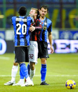 比賽的另一個(gè)焦點(diǎn)就是處于轉(zhuǎn)會(huì)漩渦中的貝克漢姆。留守米蘭受阻明顯影響到了貝帥的心情,開(kāi)賽沒(méi)多久小貝就和國(guó)米的蒙塔里發(fā)生了小摩擦,倒霉的小貝還被對(duì)手掐了脖子,不過(guò)主裁判并沒(méi)有任何表示。更倒霉的是第57分鐘,小貝因?yàn)橛掖笸燃∪饫瓊坏貌惶崆跋聢?chǎng)。