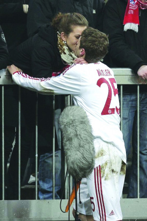 這位在租借而來的前鋒多諾萬回到美國大聯(lián)盟之后才得到出場(chǎng)機(jī)會(huì)的小將,在昨晨比賽的第72分鐘登場(chǎng),這也是他在歐冠聯(lián)賽中的處子秀,然而17分鐘過后,他就在一次角球混戰(zhàn)中攻入了個(gè)人的歐冠聯(lián)賽處子球。進(jìn)球后的穆勒顯得非常興奮,飛奔到看臺(tái)上女友所在的位置,而他的女友很默契地送上了浪漫一吻?吹竭@對(duì)恩愛的小情侶,現(xiàn)場(chǎng)所有觀眾都送出了自己的掌聲。