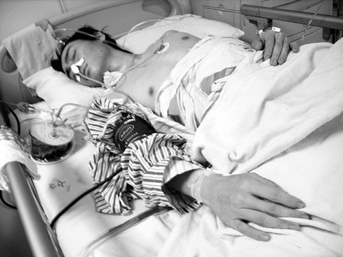 12月9日上午,記者在中國醫(yī)科大學附屬第一醫(yī)院重癥監(jiān)護室,看到身受重傷的王某仍躺在病床上接受著治療。據(jù)王某的母親介紹,王某今年22歲,原是遼寧某足球隊一名球員。今年年初時,因為家中經濟條件不是太好,再加上外面還有許多債務,無力供王某繼續(xù)踢球,王某被迫從球隊回到家中。眼下,家中正托人幫著孩子尋找工作,可工作沒有找著孩子便出了事。