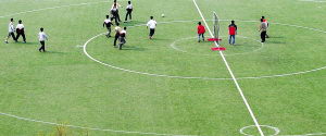 15日上午,在一所校園操場(chǎng)上,記者見(jiàn)識(shí)了一場(chǎng)別具一格的中置足球比賽。只見(jiàn)10多名運(yùn)動(dòng)員在外圍直徑30多米的圓圈內(nèi),圍著滾動(dòng)的足球時(shí)而防守,時(shí)而狂奔發(fā)起進(jìn)攻,一名隊(duì)員帶球快跑犯規(guī),裁判員立即吹響口哨,另一隊(duì)員發(fā)了一記角球,將球踢向中場(chǎng),掀起激烈的爭(zhēng)奪。守門員得球后,轉(zhuǎn)身一拋,球即進(jìn)入對(duì)方防區(qū),激烈戰(zhàn)火再次燃起……在10多分鐘的比賽中,雙方分別進(jìn)球5個(gè)和6個(gè),比賽結(jié)束時(shí),隊(duì)員們和觀眾都還意猶未盡。徐大從告訴記者,中置足球進(jìn)攻時(shí)出界球少,活動(dòng)的連續(xù)性好,有效對(duì)抗的機(jī)會(huì)多,這就使得體能較差的學(xué)生也能夠享受到足球運(yùn)動(dòng)的快樂(lè)。