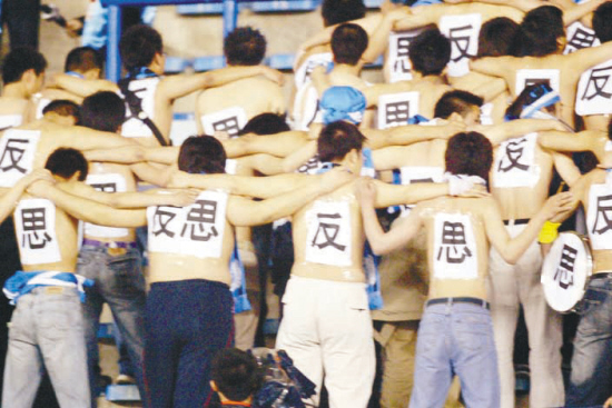 大連不愧為中國的足球城。2006年5月21日,一群大連球迷在看臺上光起膀子,背后貼滿了“反思”,這是中國球迷最真切的想法?上,中國足球沒有停止過反思,只是很少采取行動。