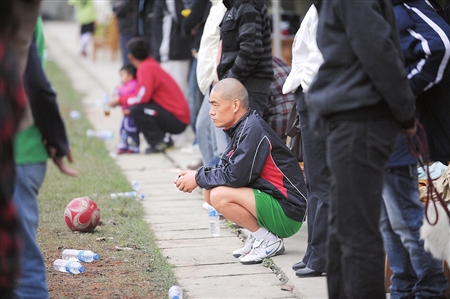 從成仁路轉(zhuǎn)到中和街道的新華路,再穿過轉(zhuǎn)角路口的雜貨部和鹵菜攤,一條小路出現(xiàn)在了面前,路牌掛在一棵高大的桉樹上,紅底白字,上面寫著足球場和游泳池。順著小路進(jìn)去,兩邊盡是農(nóng)地,機(jī)耕道有些顛簸。5分鐘后又看到了一塊牌子,也是紅底白字:成都最牛的山寨足球俱樂部——“中和聯(lián)隊(duì)俱樂部”就“藏”在這里訓(xùn)練。走過停著幾部名車的簡陋停車場,兩塊草皮足球場隨即映入眼簾。俱樂部老板唐勇訓(xùn)練正酣,而旁邊一名隊(duì)員則從球場邊的菜地里把射偏的球撿了回來!皝硗郏黄鹛咚!”唐勇干脆而熱絡(luò)地打起招呼。