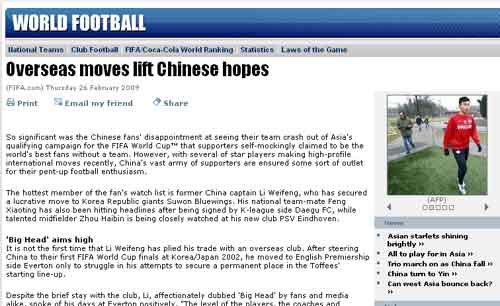 國(guó)際足聯(lián)官方網(wǎng)站昨天以《海外球員重燃中國(guó)足球希望》為題,對(duì)中國(guó)足壇新一代“留洋潮”進(jìn)行了報(bào)道。文章稱,自國(guó)足無(wú)緣南非世界杯之后,中國(guó)球迷們承受了巨大的失望。他們自嘲是“世界上最好的球迷”,但沒(méi)有匹配的球隊(duì)。然而,隨著幾名球員最近再度走出國(guó)門(mén),中國(guó)球迷們的熱情再度被調(diào)動(dòng)。