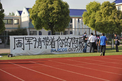 據(jù)現(xiàn)場(chǎng)目擊記者透露,該橫幅上的周字是經(jīng)過(guò)球迷改造的,周字中間的口部當(dāng)中出現(xiàn)了兩個(gè)代表美元的符號(hào)。據(jù)記者了解,之所以球迷將周軍的周字中間部分做成美元標(biāo)識(shí),是因?yàn)橛蟹婚g傳聞申花的五千萬(wàn)水貨外援讓其腰包鼓鼓。而橫幅還出現(xiàn)了巴爾克斯的名字,巴爾克斯在申花客場(chǎng)對(duì)新加波一戰(zhàn)中雖然攻進(jìn)一球,但是錯(cuò)失多次必進(jìn)球機(jī)會(huì),被認(rèn)為是申花亞冠出局的最大罪人之一,而他恰好是周軍找來(lái)的外援。
