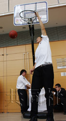 被稱為“世界第三高人”的孫明明出生于中國黑龍江省,現(xiàn)年25歲,其身高比NBA球員姚明還高出了10厘米。在7月于美國拉斯維加斯舉行的bj聯(lián)賽選秀賽上,濱松隊主帥一眼相中了孫明明。他打起廣告說“踮起腳就能灌籃。希望不了解籃球的人們也能來看球”。