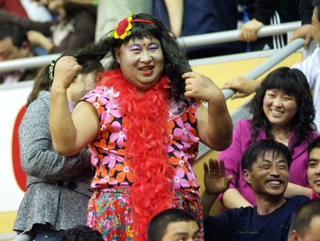 “如花”顯然是有備而來,他戴著花圍巾、穿著花衣裳,賽前先是戴著一個黑色的發(fā)套現(xiàn)身。比賽中他還到洗手間重新打扮,換上紅藍(lán)相間的發(fā)套再回到賽場。據(jù)當(dāng)?shù)孛襟w記者介紹,這個球迷是江蘇舜天隊的鐵桿球迷,大家都稱他“胖哥”。在足球場上,這個球迷也是如此打扮為江蘇舜天隊加油,看到舜天本周沒有比賽,他就到籃球賽場上來“湊熱鬧”了。(記者潘天舒)