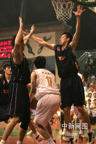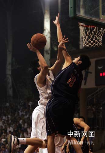 25日夜晚,2008CBA夏季聯(lián)賽第32場(chǎng)(半決賽)湖北煤投(遼寧盼盼)與天鐵集團(tuán)(江蘇南鋼)在激戰(zhàn)中。作 者:張?jiān)?
