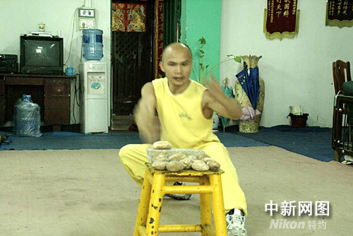 黎偉軍的武林絕技,掌劈鵝卵石。作者 曾令華