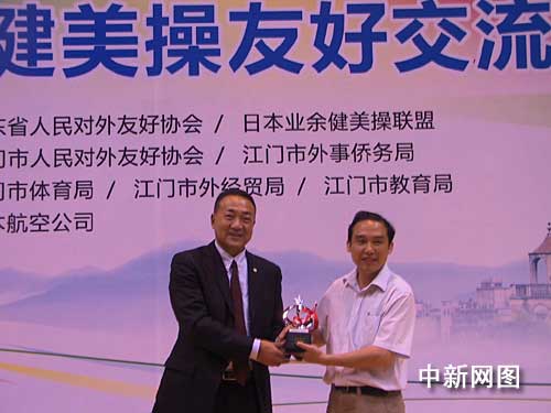 圖為江門市政府與日本業(yè)余健美操聯(lián)盟交換紀(jì)念品。