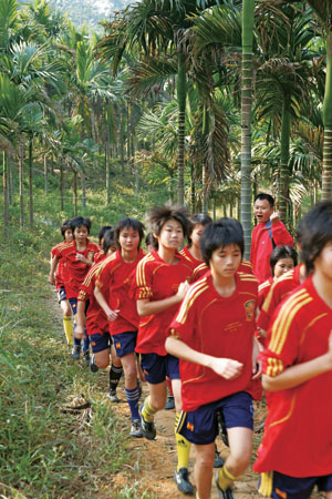 再往里走,便看見了一群十五六歲的女孩。她們穿著統(tǒng)一的紅色運動衣,在坑洼不平的操場上奔跑著,身旁跟隨著她們的教練肖山,剛才那個沙啞的聲音就是他喊的!敖裉煊柧毐憩F(xiàn)最好的隊員,一會兒才有雞腿吃!”肖教練說。