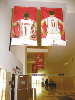 【鏡頭一】從豐田中心正門(mén)進(jìn)去,首先進(jìn)入眼簾的,是掛在空中的兩個(gè)巨大背影——姚明和麥迪,遠(yuǎn)處是威爾斯和阿爾斯通。(下左圖)