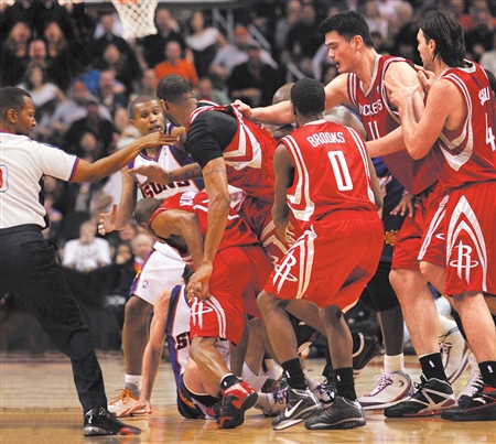 NBA比賽絕對(duì)能給人以強(qiáng)烈的視聽沖擊,每一場(chǎng)比賽你甚至能聽到“肌肉碰撞”的聲音。因此,在這個(gè)大個(gè)子們、壯漢們充塞的賽場(chǎng),可以想見雄性荷爾蒙的濃度——一個(gè)動(dòng)作或者一次口角都會(huì)點(diǎn)燃一場(chǎng)毆斗。比如昨天火箭與太陽(yáng)的比賽,一個(gè)帶有挑釁性的肘部動(dòng)作就引來(lái)雙方大打出手——為了自家兄弟,決不能在氣勢(shì)上輸陣——所以你才看到了好好先生姚明沖將上去。不過(guò),這種場(chǎng)面對(duì)于見慣了NBA大場(chǎng)面的球迷,根本就是小菜一碟!