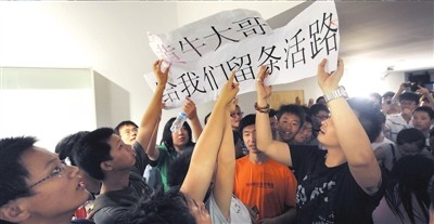 昨天上午11點(diǎn),300余名國(guó)安球迷涌入國(guó)安足球俱樂部?jī)?nèi)短短二三十米長(zhǎng)的通道,他們高舉著“黃牛大哥,給我們留條活路”的標(biāo)語(yǔ),情緒十分激動(dòng),抗議“黃!眽艛嚅T票,要求俱樂部保障球迷的利益。由于人數(shù)眾多,現(xiàn)場(chǎng)的暖氣片也被球迷擠壞,暖氣管道里的水灑了一地,廢棄的飲料瓶等雜物也隨處可見。陸續(xù)有數(shù)名民警趕到現(xiàn)場(chǎng)維持秩序,防止球迷出現(xiàn)過激行為。