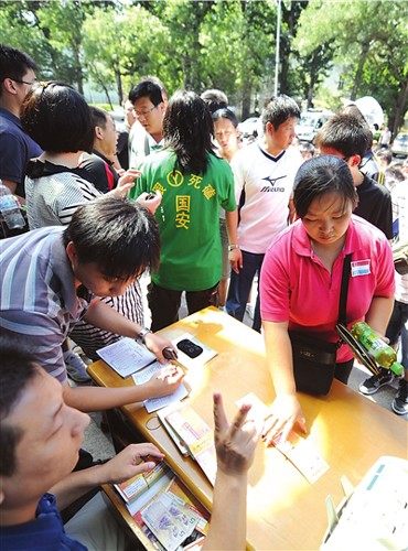 據(jù)球迷王先生介紹,他想要購(gòu)買的是本月30日國(guó)安對(duì)陣魯能的比賽門票!瓣P(guān)系到國(guó)安今年能否在中超奪冠,作為十幾年的國(guó)安球迷,這場(chǎng)比賽我們必須去見證!睘橘I到門票,王先生昨天早上5點(diǎn)就到工體北門守候。當(dāng)時(shí)排在他前面的人只有5個(gè),按照當(dāng)天該售票點(diǎn)發(fā)售500張票、每位球迷限買兩張票的情況,他覺得無(wú)論如何都能買上票。