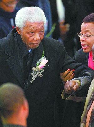 澤娜妮是在世界杯開(kāi)幕前夜不幸遇難的,91歲高齡的曼德拉也因此取消了出席開(kāi)幕式的計(jì)劃。上午8時(shí),悼念儀式在學(xué)校禮堂舉行。熱愛(ài)音樂(lè)的澤娜妮生前是該校唱詩(shī)班和樂(lè)隊(duì)的成員,幾乎每個(gè)人都喜歡這位性格開(kāi)朗、活潑的小女孩。儀式以一首悼念歌曲開(kāi)始,緊接著播放了一組幻燈片,由澤娜妮與曼德拉開(kāi)心擁抱的合影組成。隨后,幾位親屬代表上前致悼詞。老曼德拉也在親人的陪伴下,步履蹣跚地來(lái)到儀式現(xiàn)場(chǎng),他的衣襟上別著一小簇粉紅色的花束,始終坐在前排,神情十分哀傷。