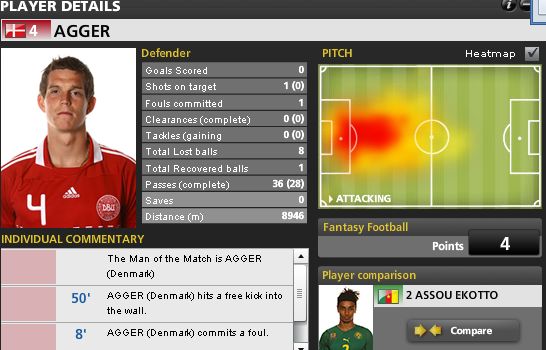 第6分鐘,阿格成功防守,喀麥隆隊前鋒韋博突破后進(jìn)攻被破壞而惱羞成怒,對其犯規(guī)。第20分鐘,喀麥隆隊中場大將恩瑪納禁區(qū)前沿拿球突破,沒有能夠突破阿格的防守。40分鐘時,喀麥隆隊前場反擊,不過他們的直傳球被阿格成功攔截。下半場第7分鐘,埃托奧前場傳球恩瑪納,后者禁區(qū)前一帶想尋求突破,不過阿格的貼身防守非常成功,球被破壞出了邊線。下半場第14分鐘,喀麥隆隊后場搶斷發(fā)動反擊,埃托奧禁區(qū)內(nèi)帶球摔倒了,不過主裁判并沒有吹罰丹麥隊球員犯規(guī),因為阿格的防守非常干凈。1分鐘后,阿格倒地鏟球,將埃托奧的帶球斷下,化解了門前險情。