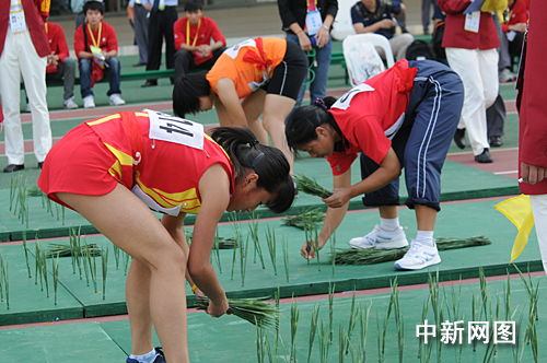 “剛開始感覺(插秧)很有趣,不過練起來可就沒那么輕松了!边@是林貴婷談到比賽時印象最深的一點。記者在現(xiàn)場看到,比賽在60米長的直跑道上進行,選手需先挑起籮筐,單手依次拾起20米處扎成捆的的塑料秧苗,然后在一塊鉆有300個小孔的綠色木板上進行比賽。