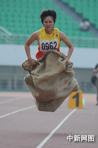 在今天上午進(jìn)行的第六屆全國農(nóng)民運(yùn)動(dòng)會(huì)田徑比賽中,60米麻袋跳搬運(yùn)賽跑成為全場亮點(diǎn)。選手需在麻袋里“蹦”到沙袋前,然后徒手將沙袋搬運(yùn)到終點(diǎn)。圖為廣西選手在比賽中“一飛沖天”。