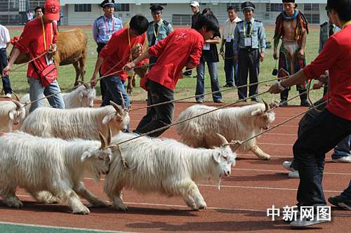 “今早明明還很乖,我還帶它在場地里散步吃草呢!睗M頭大汗的志愿者小陳終于“拽”住了還在“意猶未盡”到處亂蹦的山羊。據(jù)小陳介紹,這些是本應(yīng)在女子搏克頒獎(jiǎng)式上作為獎(jiǎng)品出場的羊!肮烙(jì)它們沒見過什么大場面,又被這么多相機(jī)的閃光嚇得要命,再加上今早天氣很熱,所以就‘造反’了!