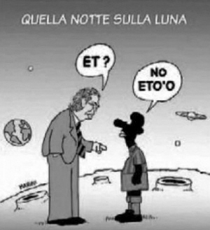 漫畫的標題是“Quella Notte Sulla Luna(月球上的那一晚)”,借著“人類登月40周年”的名頭來調(diào)侃一下意甲的轉(zhuǎn)會。月球的環(huán)形山之間,站著兩個卡通人物,左邊身穿藍色西裝的老頭,是國際米蘭主席莫拉蒂,右邊身穿紅藍色巴薩球衣的黑人,是喀麥隆前鋒埃托奧。