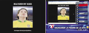 當(dāng)?shù)貢r間周五,阿根廷TN電視臺報道了一起網(wǎng)絡(luò)襲擊事件,一名自稱為“KKR”的黑客襲擊了阿根廷足協(xié)官方網(wǎng)站(.ar),在阿根廷足協(xié)官網(wǎng)上放上了一張馬拉多納身穿巴西國家隊球衣的照片。