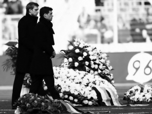 上午10點18分,恩克的靈柩被安置在了球場的中央,靈柩周圍擺放了白玫瑰和花環(huán),聯(lián)邦內(nèi)務部長也放上了一叢顏色搭配成黑紅金色代表德國國旗的花。前德國總理施羅德和夫人以及德國著名主持人貝克曼也來到球場送別恩克。此時,體育場外已經(jīng)變成了燭光的海洋,數(shù)萬名未能進場的球迷借此寄托哀思。