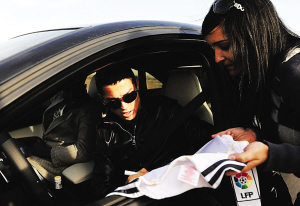 傷勢痊愈即將參賽,也令C羅心情大好。當C羅在結(jié)束訓練駕車離開時,受到了皇馬球迷的熱烈歡迎。球迷高舉著他的球衣,呼喊C羅的名字,而C羅也以禮相待,盡量滿足球迷的要求,簽名、合影留念,皇馬頭牌十分有親和力,更是在車里耐心地為一位美女球迷簽名,并且滿足了其合影的要求。換了新發(fā)型,挑染了頭發(fā),帶著太陽眼鏡,穿著閃亮的皮衣,似乎來到了馬德里,和這里眾多的造型達人朝夕相處,C羅的時尚觸覺也更加提升了。