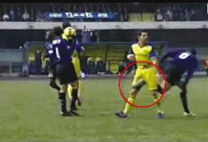在本輪結(jié)束的國米與切沃的比賽中,盧西奧使出了一招“蝎子擺尾”,但是目標(biāo)卻是對手的襠部。