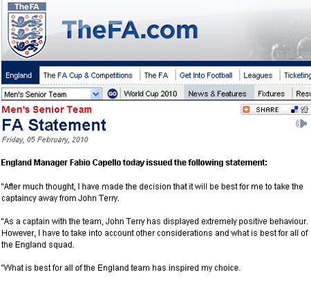 英格蘭主帥卡佩羅在英足總官網(wǎng)上的聲明中表示:“經(jīng)過深思熟慮后,我決定撤銷約翰·特里的隊(duì)長職務(wù)。作為國家隊(duì)隊(duì)長,約翰·特里在場上的表現(xiàn)無可挑剔,但我要做出的決定更多的是為了整個(gè)英格蘭隊(duì)考慮。”