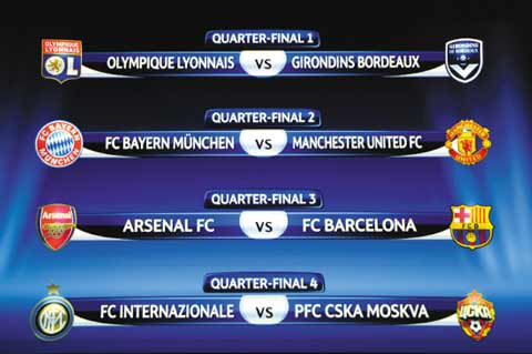 歐冠1/4決賽和半決賽對(duì)陣形勢昨晚在瑞士尼翁揭曉,上半?yún)^(qū)是拜仁慕尼黑對(duì)曼聯(lián)、里昂對(duì)波爾多,下半?yún)^(qū)是阿森納對(duì)巴塞羅那、國際米蘭對(duì)莫斯科中央陸軍,“重逢”成為本次抽簽的主題。由英超球隊(duì)包辦半決賽3個(gè)席位的乏味場面本賽季絕不會(huì)出現(xiàn)了,本賽季8強(qiáng)來自6個(gè)國家的聯(lián)賽。