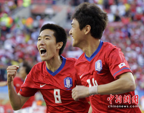 中新網(wǎng)6月12日電 北京時間今晚,在南非世界杯B組的一場小組賽中,韓國隊憑借李正秀和樸智星的進球2-0完勝希臘取得開門紅。這也是韓國參加世界杯以來在本土外的第二場勝利。