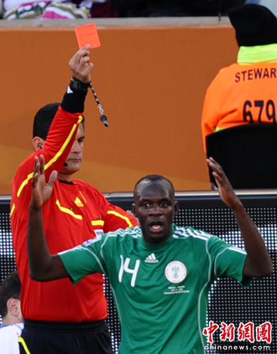 開場后雙方都比較謹慎,比賽略顯沉悶。上半時進行到第16分鐘尼日利亞率先打破僵局,希臘后衛(wèi)帕帕斯塔多普洛斯拉倒尼日利亞奧代姆溫吉,裁判判罰任意球并掏出黃牌。尼日利亞12號前鋒烏切任意球直接射門破門,這也是本屆世界杯賽場上第一個任意球直接破門。