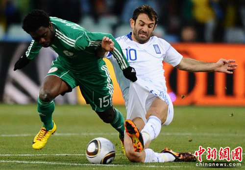 中新網6月17日電 北京時間今晚22時,南非世界杯B組第二輪比賽打響,由歐洲勁旅希臘在布隆方丹的自由洲球場迎戰(zhàn)非洲雄鷹尼日利亞。上班時尼日利亞任意球率先破門,但此后被紅牌罰下一人,希臘隊隨即抓住機會,在上下半場各入一球,以2-1逆轉擊敗尼日利亞隊。