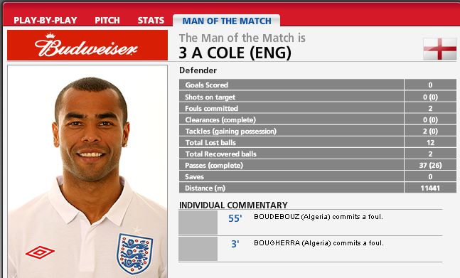 中新網(wǎng)6月19日電 在今天凌晨結(jié)束的一場世界杯小組賽中,英格蘭隊(duì)邊后衛(wèi)阿什利·科爾被評(píng)為全場最佳球員。不過從賽后國際足聯(lián)公布的技術(shù)統(tǒng)計(jì)來看,這位“全場最佳”的數(shù)據(jù)可以用“慘不忍睹”來形容。