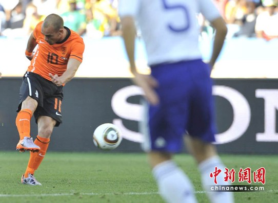 在經(jīng)歷了多半場(chǎng)比賽的僵持后,第53分鐘,“橙衣軍團(tuán)”終于撕開(kāi)對(duì)手防線,范佩西回做,斯內(nèi)德禁區(qū)外沒(méi)有停球直接大力遠(yuǎn)射,日本門(mén)將川島永嗣奮力撲救,足球碰到他的左臂彈進(jìn)網(wǎng)窩,1比0,荷蘭隊(duì)取得勝利。