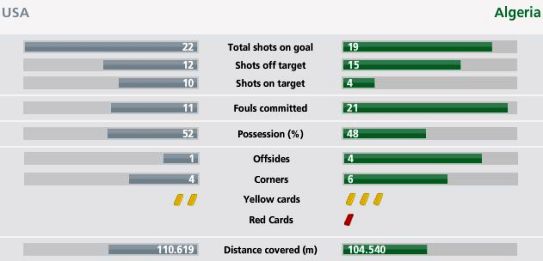 本場(chǎng)比賽,美國(guó)隊(duì)和阿爾及利亞隊(duì)都有很多進(jìn)球的機(jī)會(huì)。其中美國(guó)隊(duì)全場(chǎng)22腳射門,10腳擊中門框范圍內(nèi),12腳射偏。美國(guó)隊(duì)的射門精度明顯高于阿爾及利亞,后者全場(chǎng)19腳射門只有4腳射入球門框范圍內(nèi)。全場(chǎng)比賽看來,美國(guó)隊(duì)的攻勢(shì)明顯更有威脅。