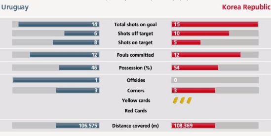 在射門方面,韓國隊以15次射門領先于對手的14次,不過,他們的射門效率不如烏拉圭,只有5次射中門框范圍內(nèi),而烏拉圭隊是8次。烏拉圭隊的8次射正門框范圍內(nèi),主要歸功于該隊的效率之王——本場比賽的最佳球員蘇亞雷斯。蘇亞雷斯6腳射門5次正門框范圍打入2球,成為本場比賽的關鍵人物。韓國隊輸球,歸根結底還是輸在了球星的成色上。