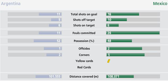 本場比賽,墨西哥隊射門16次,遠多于阿根廷隊的11次,兩隊各有6次射門擊中門框范圍之內(nèi)。墨西哥隊獲得的角球也多于阿根廷隊,他們得到了5個,而阿根廷只有2個角球。