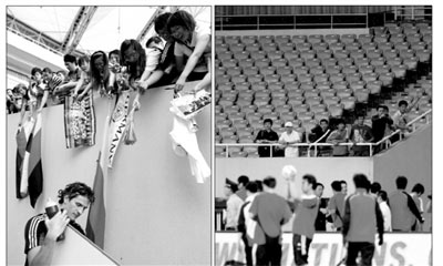 然而,這樣的熱烈氛圍隨著中國隊的到來消散殆盡。當(dāng)?shù)聡犕藞、中國隊進(jìn)場時,近2000名球迷竟然像潮水退潮一般,轉(zhuǎn)眼就迅速地隨德國隊一同離場。一名女球迷在撤退時向同伴高喊:“中國隊來了,快跑!”最終堅持留在體育場看中國隊訓(xùn)練的球迷,竟然只有屈指可數(shù)的8個人。(記者鄭小龍)