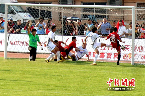 下半場易邊再戰(zhàn),雙方球員拼搶勢頭更加激烈。第67分鐘,南昌隊(duì)在禁區(qū)內(nèi)獲得點(diǎn)球機(jī)會,門將程曉鵬主罰點(diǎn)球被撲出,焦鳳波接著補(bǔ)射再次被擋出,但隨后被回防的泰達(dá)隊(duì)佐里奇把球打在焦鳳波身上彈進(jìn)球門,裁判示意進(jìn)球有效。