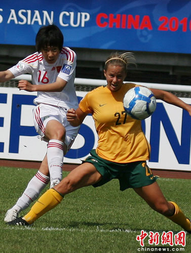 中新網(wǎng)成都5月23電(記者劉忠俊 劉賢)5月23日,2010年女足亞洲杯B小組賽中國迎戰(zhàn)澳大利亞隊(duì),比賽開后,澳大利亞占上風(fēng),中國姑娘們奮力防守,在開場(chǎng)9分鐘左右,中國隊(duì)16號(hào)前衛(wèi)突破對(duì)方防守,帶球攻門成功,為中國隊(duì)攻進(jìn)第一個(gè)球。
