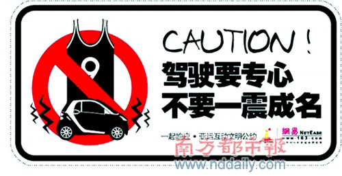 在剛剛結(jié)束的車展上,網(wǎng)易為推廣《亞運文明公約》,特推出了一套以“孫悅車震事件”為主題的搞笑車貼向觀眾派發(fā)。車貼上寫著:駕駛要專心,不要一震成名,F(xiàn)場不少參觀者看到“孫悅車貼”后,都忍不住咧嘴偷笑。