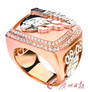 據(jù)鉆戒設(shè)計(jì)人員透露,為使設(shè)計(jì)更加新穎,在材質(zhì)的挑選上采用了正逐漸成為全球珠寶市場(chǎng)主流的18K玫瑰金,每枚重達(dá)40克,頂部鐫刻著廣東隊(duì)的隊(duì)標(biāo),環(huán)繞以79粒晶瑩的高品質(zhì)鉆石;戒指的右側(cè)面鐫刻著“08-09”的字樣和CBA籃球面孔的標(biāo)志,左側(cè)是球員姓名及球衣號(hào)碼;指環(huán)下方用鐳射技術(shù)刻有“戴夢(mèng)得”的字樣。整個(gè)戒指通體造型渾厚穩(wěn)重,溢彩流光,充分表現(xiàn)出冠軍球隊(duì)的王者之氣。戒指上的信息全部采用工藝復(fù)雜的分件倒模技術(shù),呈現(xiàn)凸字效果,增加戒指立體感及時(shí)尚感。