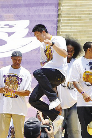 在杰克遜登臺(tái)之后,現(xiàn)場(chǎng)主持人開始依次介紹湖人球員,而第一個(gè)被介紹的,就是湖人唯一的新秀,中國球員孫悅。在聽到自己的名字被點(diǎn)到時(shí),孫悅顯得十分興奮,走到了舞臺(tái)的中央,并高高躍起在空中轉(zhuǎn)了一個(gè)圈,讓一些正在觀看的記者驚呼見到了“中國功夫”。