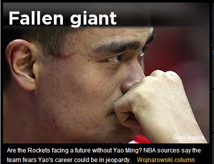 中新網(wǎng)6月30日電 北京時(shí)間今日凌晨,雅虎體育以“巨人的墜落”為題報(bào)道稱:姚明腳踝傷勢已非常嚴(yán)重,可能缺席下賽季大部分常規(guī)賽。隨后美國媒體紛紛對(duì)此事發(fā)表評(píng)論。