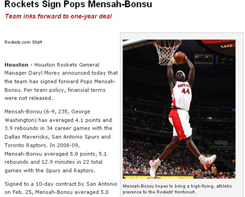 中新網(wǎng)9月4日電 北京時(shí)間今日,火箭官方宣布簽下英國內(nèi)線波普-門薩邦蘇,他的非保障性合同為期一年。門薩邦蘇目前不能確定在火箭打完整個2009-10賽季。